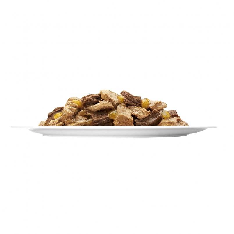 «Аппетитные кусочки с двойным вкусом» имеют четыре рациона, каждый из которых представлен двумя разновидностями мяса и рыбы в желе: