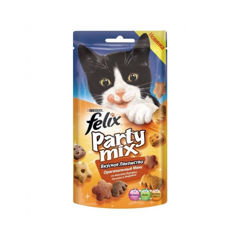 Felix Party Mix | Сухое лакомство, дополнение к корму | Не является основным видом корма, относится к лакомствам. Оно может служить в качестве поощрения питомца или дополнения к основному приёму пищи. Это сухое фигурное лакомство, представленное в 4 наименованиях: гриль микс; оригинальный, сырный или морской микс. |