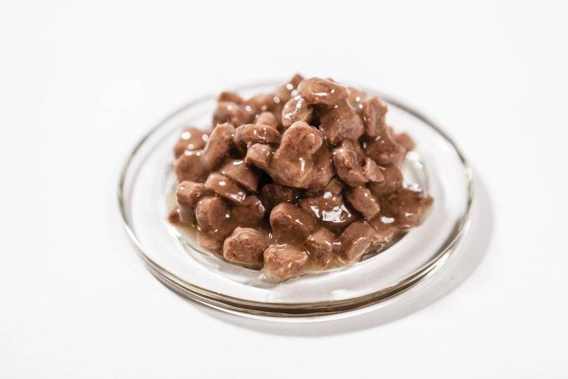 Производитель не указывает, какое именно мясо и субпродукты использованы, поэтому нельзя узнать, на самом ли деле все 4% составляет именно говядина. Под растительным белком подразумевается соя и прочие подобные бобовые продукты. Процент влажности данной продукции составляет 80%, в ней содержится 13% сырого протеина, 3% жира.