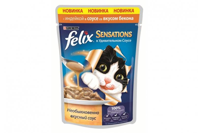 «Sensation в соусе». Влажный корм, состоящий из мяса утки, индейки, говядины или рыбы, дополненного овощами (томатами либо морковью).