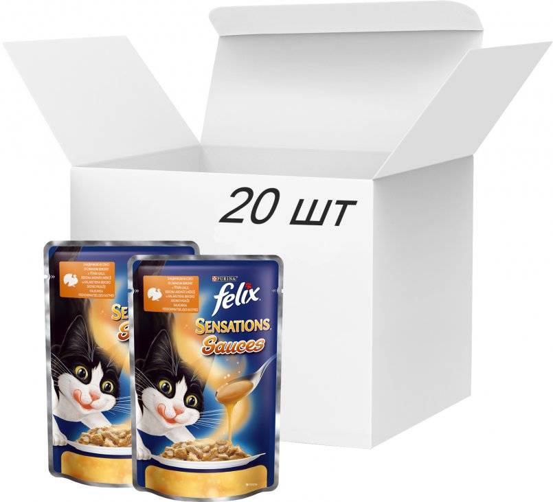 Felix Sensations в соусе | Влажный корм | Доступен в 4 наименованиях: с говядиной в томатном соусе, с треской и свежими томатами, с индейкой в специальном соусе и с добавлением моркови. Корм представляет собой влажные мясные или рыбные кусочки, облитые соусом. |