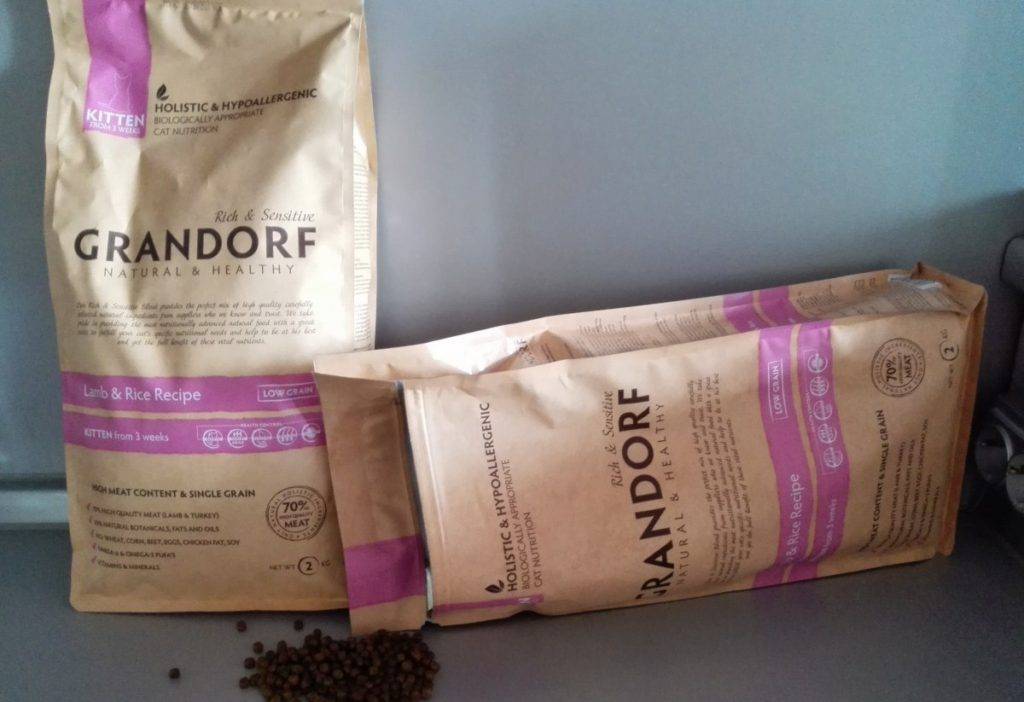 Grandorf Kitten – содержит 70% мяса, поскольку маленькие котята отличаются чувствительностью желудка, для них выпустили смесь из двух видов самого диетического мяса — индейки и ягненка. В остальные 30% входит рис и комплекс витаминов и минералов, куда добавлена небольшая доза цикория. В нем содержится полисахарид инулин, который жизненно необходим для обеспечения здоровой и сбалансированной микрофлоры кишечника. Его можно принимать и беременным кошкам.