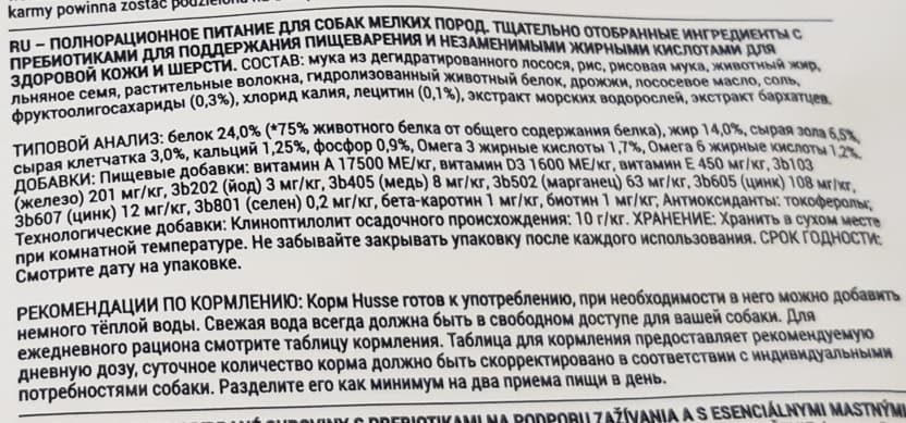 Ознакомимся с составом корма Husse на примере варианта Sensitive Ocean Care Mini (для собак маленьких пород, с лососем и рисом):