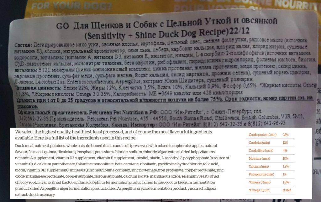 Рассмотрим состав корма GO! на примере варианта SENSITIVITY + SHINE Duck Recipe (для собак с чувствительным пищеварением, рецепт с уткой). Посмотреть состав можно на изображении ниже, кликните по фото чтобы увеличить его для удобности чтения:
