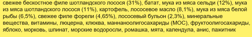 На первой позиции – освобожденное от костей филе лосося. Далее расположен батат – сладкий картофель, количество которого не указано. В кормосмесь включили три вида рыбной муки, филе форели, лососевый бульон. По аминокислотному составу и гипоаллергенным свойствам корма из высококачественной рыбы превосходят мясные продукты.