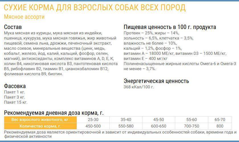 - основной источник белка — мясные ингредиенты (мясная мука);