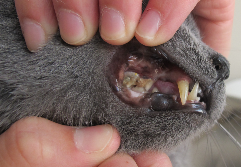 Кошка может трясти головой и тереть лапами мордочку. При попытке осмотреть пасть животное проявляет агрессию, пытается убежать.