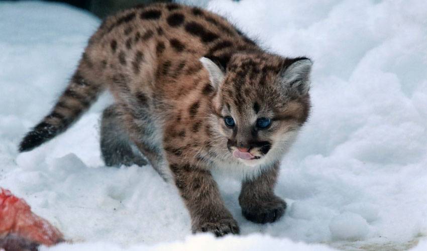 У детенышей пумы окраска другая – густая шерстка усыпана очень темными пятнышками, на передних и задних лапках – полоски, а хвостик – в «колечках».