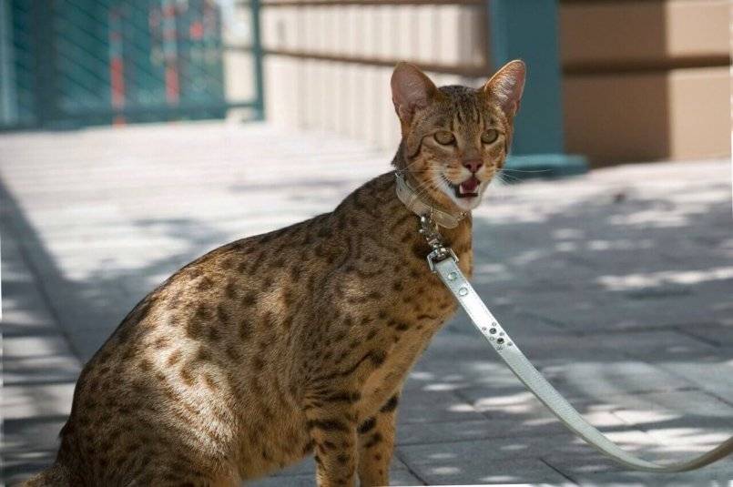 Крупные саванны любят большие пространства, если дома ей места недостаточно, советуется регулярно выводить животное на прогулку. Для этого подойдет обычный кошачий или собачий (на маленькие породы) ошейник и не очень длинный поводок.