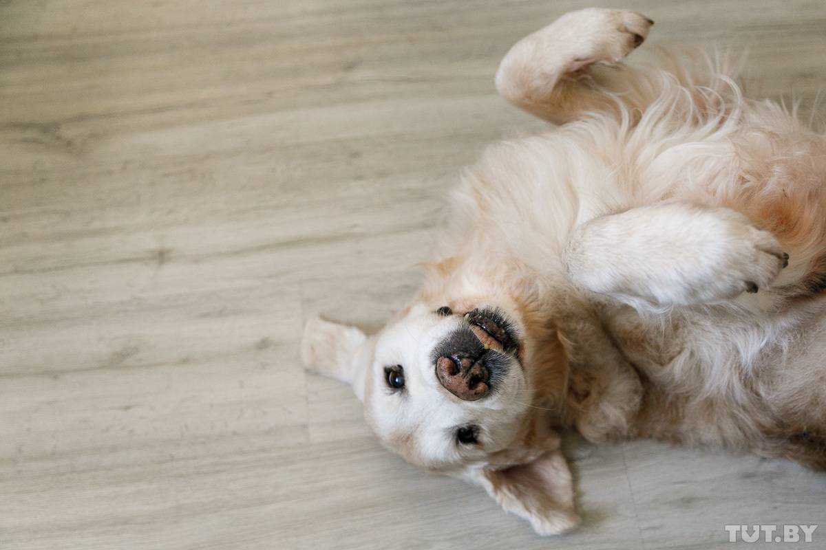 Как будто в подтверждение Олиных слов Рай заваливается на спину и начинает кататься по полу и делать смешные морды. «Хорошая собака», — говорим мы. А Юля подсказывает: «Вы руками его „хвалите“. Гладьте его, он же не слышит».