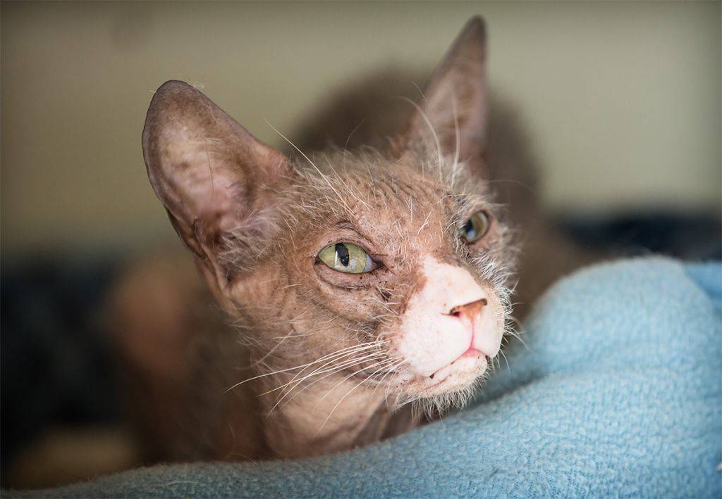 - Шерсть достаточно редкая, мягкая на ощупь. Ее длина варьируется от короткой до умеренно длинной. Подшерсток минимальный или отсутствует. Остевой волос, покрывающий тело, длинный. Густота шерсти зависит от сезона. Неравномерные пучки волос покрывают почти все тело животного. Нос, область вокруг глаз и кончики лап абсолютно лысые. Во время линьки кошки лишаются почти всей шерсти. В этот период они кажутся особенно болезненными и изможденными.