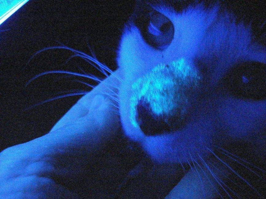 - При помощи лампы Вуда. Данный метод позволяет выявить участки грибкового поражения, подсвечиваемые флуоресцентной лампой. Очаги поражения выделены ярким зеленым светом. К сожалению, определить лишай у кошки при помощи только лампы Вуда не возможно, так как некоторые споры патогенной грибковой микрофлоры не дают свечения, а условно-патогенная грибковая микрофлора может отсвечивать.