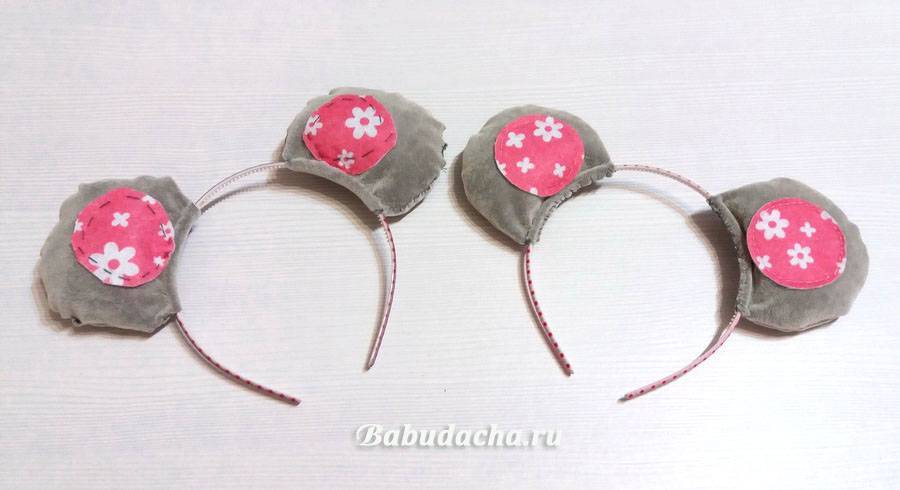 За основу взять ободок. Ушки также можно сделать из фетра или из цветного картона (лучше из бархатного, если есть). Из фетра также можно прошить или склеить, лучше сделать двойные, легче будет закрепить на ободке (обернуть краешками ободок) пришить или приклеить к ободку. Если ободок серого цвета, можно оставить так, если другого цвета, то просто обернуть серой тканью или лентой, зафиксировав ее клеем.