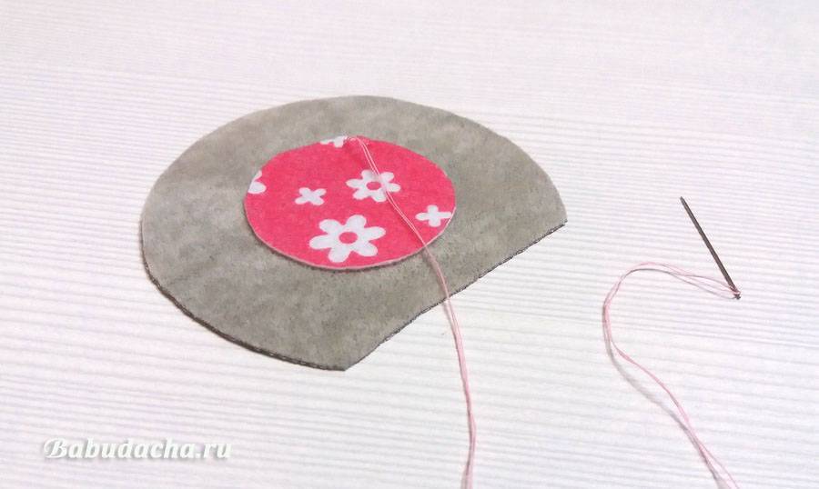Затем складываем их вместе и с одного конца подрезаем, как показано на фото. Из розового фетра вырезаем круги поменьше и сразу пришиваем на серую основу: