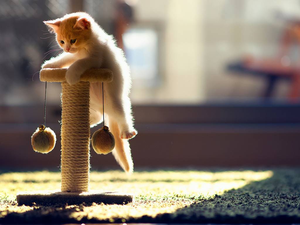 - Надо поставить или повесить на конструкцию какую-то игрушку, которой животное любит забавляться. Кот будет тянуться за ней и нечаянно задевать когтями сооружение. Скорее всего, ему придется по вкусу такой способ ухода за когтями.