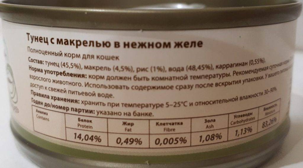 Основа корма — рыба, а именно 45,5% тунца и 4,5% макрели. (В других, не рыбных вариантах, основа консервов — курица). Дополнительные ингредиенты — рис 1% (источник углеводов), вода 48,45% (используется для желе), каррагинан 0,55% (природный гелеобразователь, нужен для создания желе).