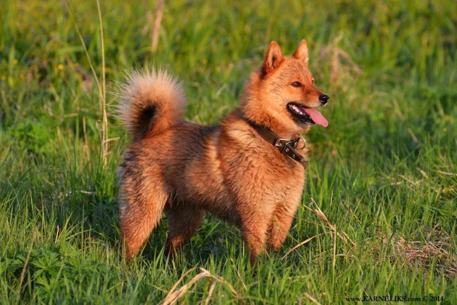 В целом, собаки похожи на Шпицев – квадратный корпус, жесткая шерсть, пушистый хвост «бубликом», голова клиновидной формы, лисий прищур и узкая морда. Особенность вида – ярко-красный окрас. Вырастают карелки до 50 см, среди Лаек они самые мелкие. Средняя стоимость щенков – 22-26 тысяч рублей.