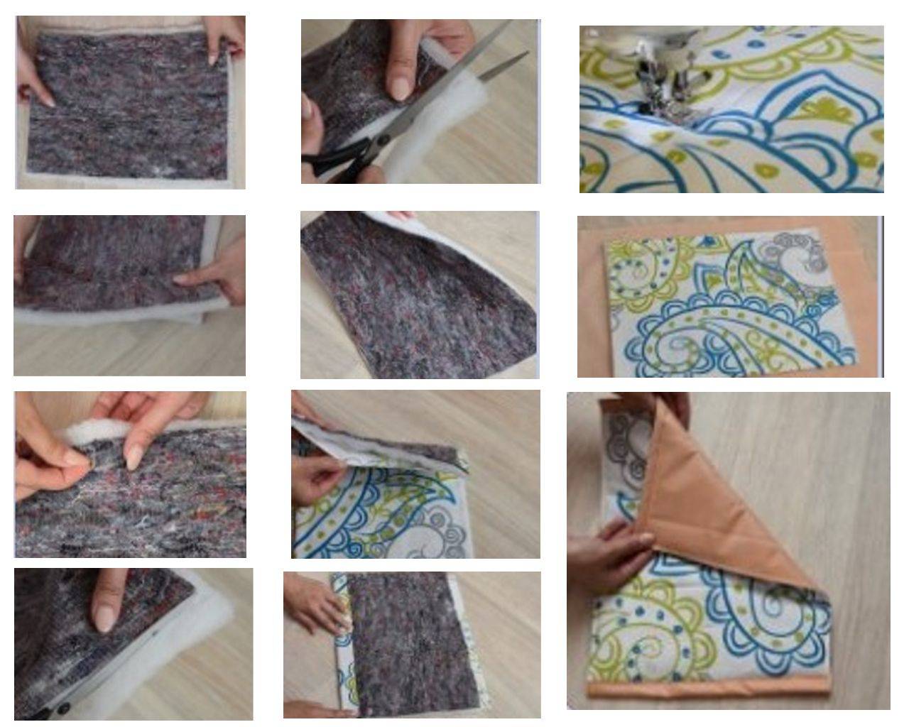 - Сложить изделие и прошить на швейной машинке по краям все части, а потом ромбом по всему полотну, как стеганое одеяло.