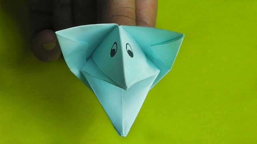 Чтобы закончить формирование морды, нужно загнуть нижний угол треугольника вверх, как показано на рисунке 4. Дальше фломастером или карандашом можно нарисовать глазки, нос и рот. Собака готова.