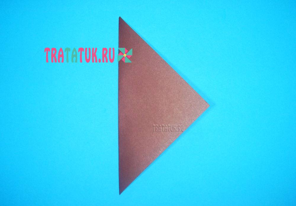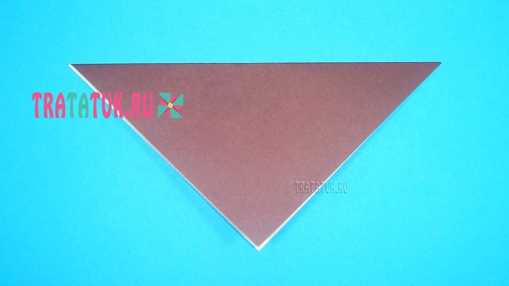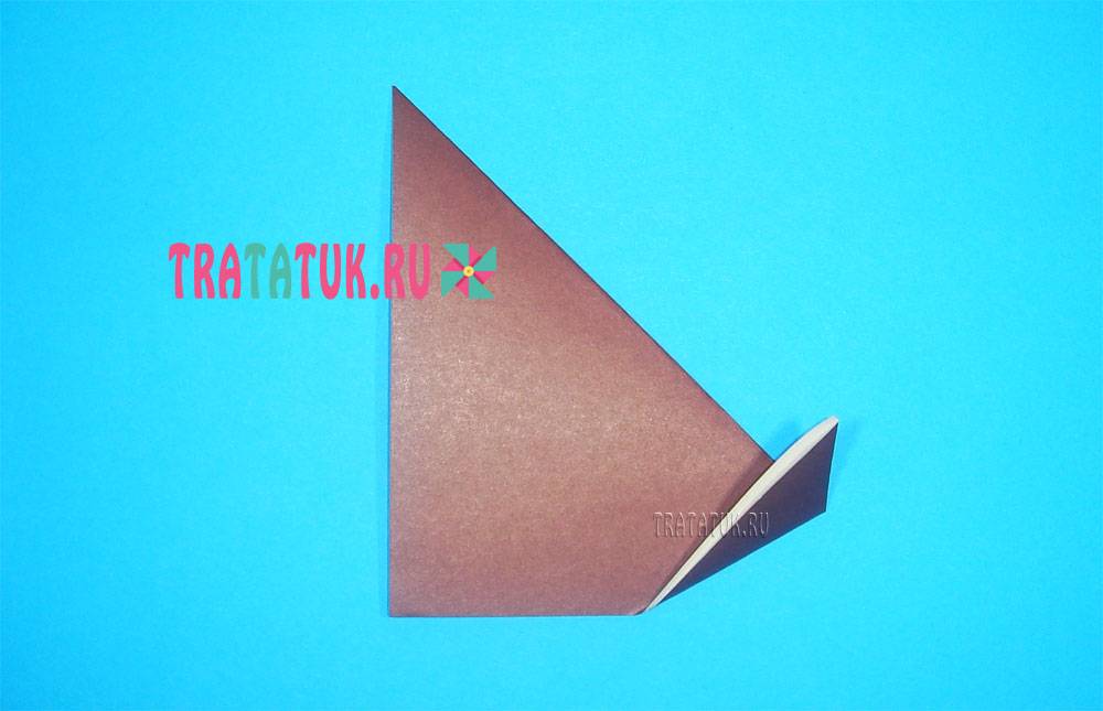 Сгиб в данном случае находится слева, переверните треугольник так, чтобы сгиб оказался справа. Загните вверх правый уголок, чтобы сделать хвостик. Все, простенькое туловище готово.