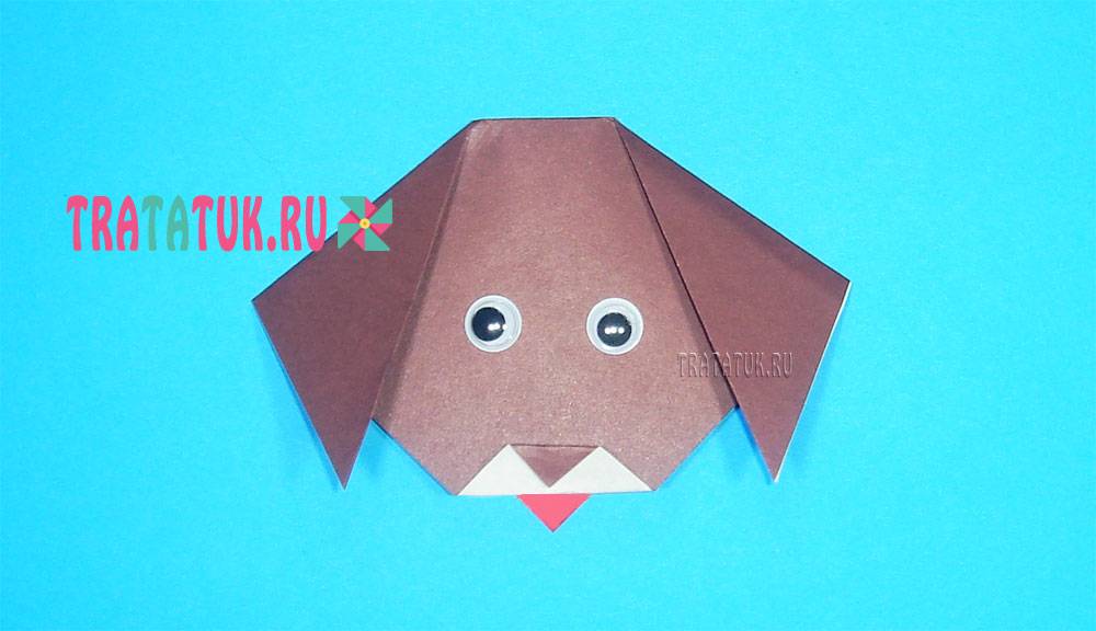Осталось только приклеить к нему голову, чтобы получилась вот такая симпатичная оригами собака для детей.