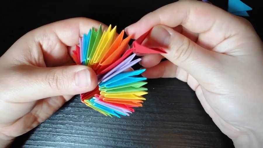 - 5 рядочек из 17 модулей формируют чередованием: 3 оригами-модуля надевают как обычно, а 2 следующих надевают на 2 лучика. Продолжают так до конца ряда.