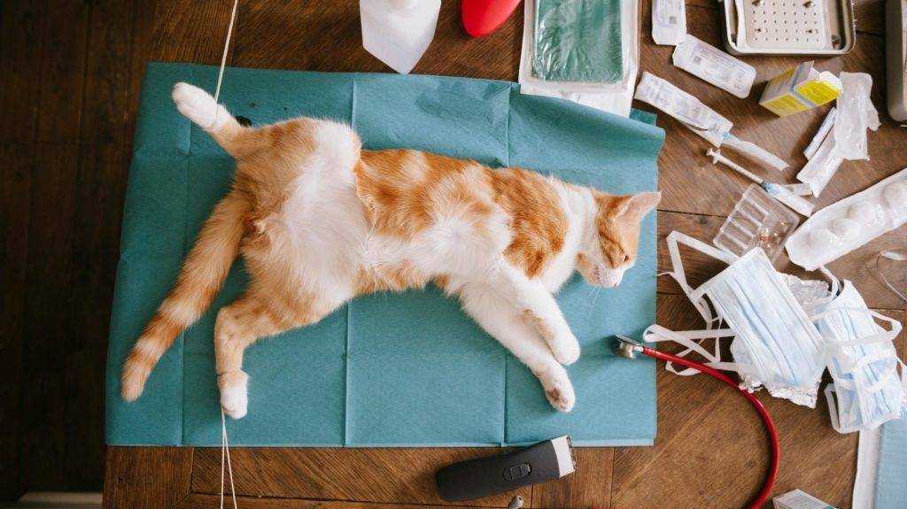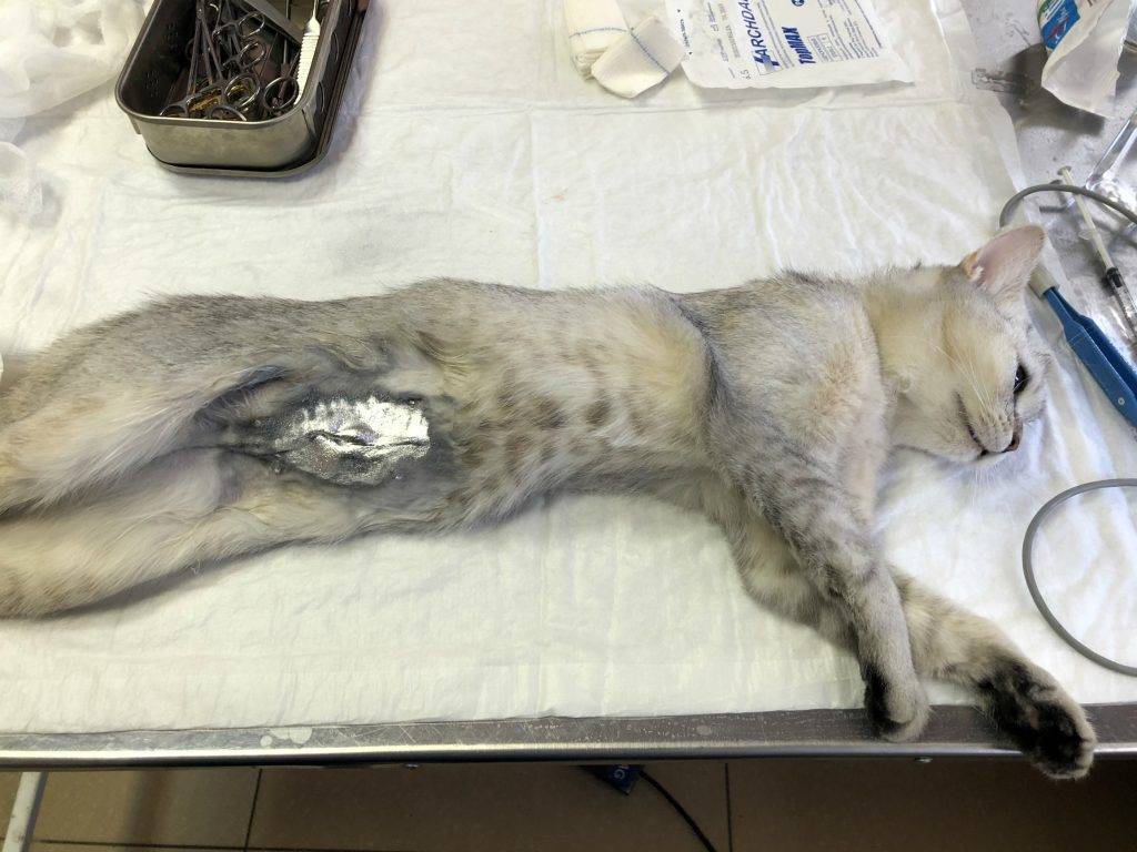 Еще спящую под наркозом кошку следует уложить набок. Со стороны спины можно приложить теплую грелку.