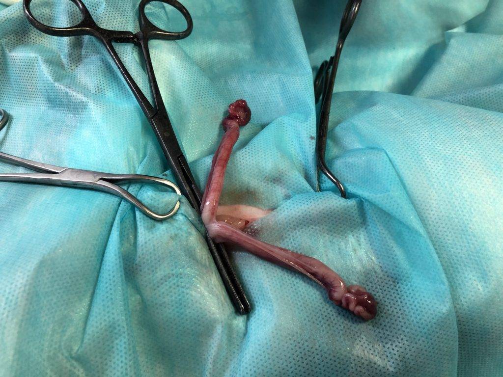 Оба рога матки и яичники извлечены, остается наложить лигатуру на тело матки, чтобы удалить ее целиком