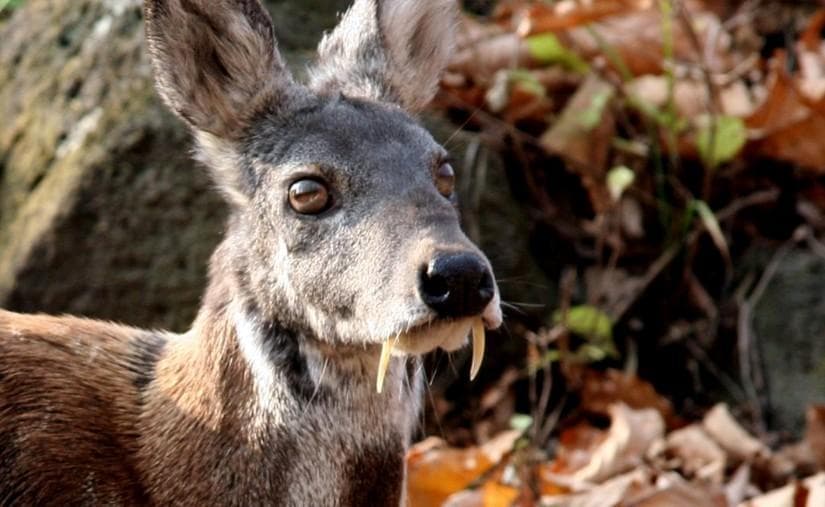 Хохлатые олени обитают в Китае. Эти животные весят до 50 килограммов. Самцы хохлатых оленей имеют выступающие изо рта длинные клыки. Этими клыками можно напугать даже бывалого охотника.