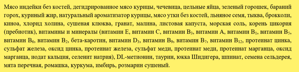 В составе рациона содержится большое количество свежего мяса и мясной муки – около 40%. Источниками полноценных белков являются мясо птицы (курица, индейка и утка), ягненок, рыбное филе (лосось и форель), а также сухое цельное яйцо. Источниками углеводов служат молотый рис, овсяная мука, молотые цельные зерна кукурузы, а также бобовые продукты с низким гликемическим индексом – зеленый горошек и турецкий горох.