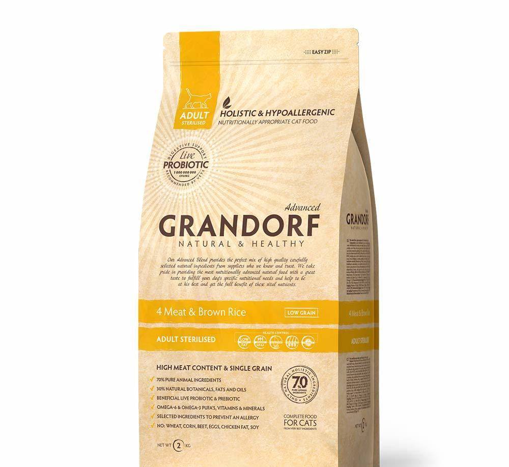- 1 место. Ну а какой корм для стерилизованных кошек самый лучший? Такого звания удостоился корм из коричневого риса и четырех сортов мяса, предназначенный специально для кастрированных питомцев, – GRANDORF. Компоненты смеси в процессе приготовления подвергаются минимальной термообработке, за счет чего сохраняют свои полезные свойства. В составе присутствуют растительные ингредиенты, которые эффективно борются с формированием камней в почках. К тому же это гипоаллергенный корм, который содержит минимальное количество солей магния и фосфора.