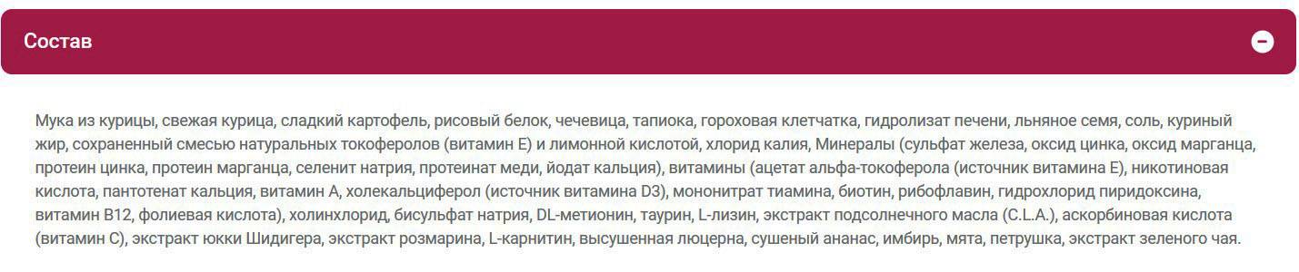 Подобная ситуация наблюдается здесь и с компонентом «натуральный ароматизатор» — неизвестно, что именно сюда добавили для усиления вкусовой привлекательности рациона.