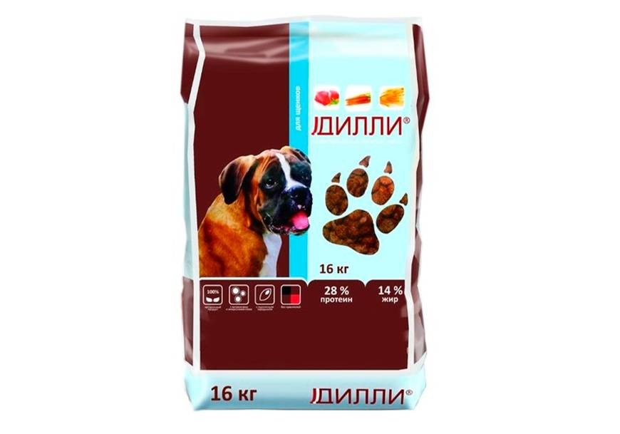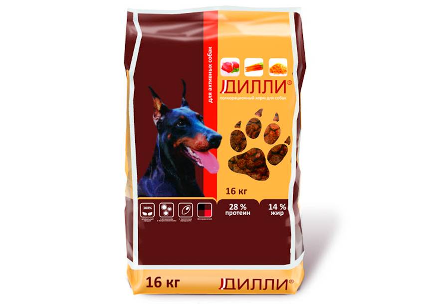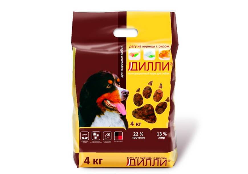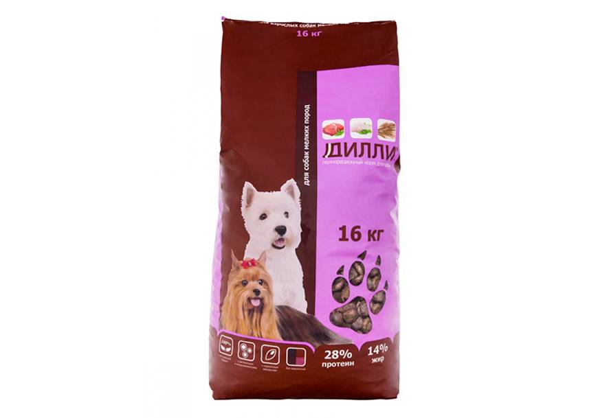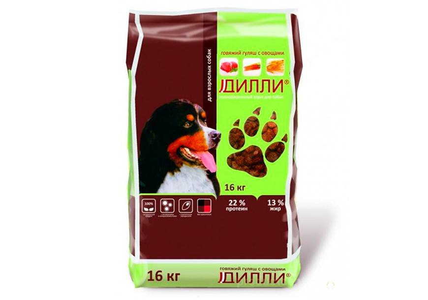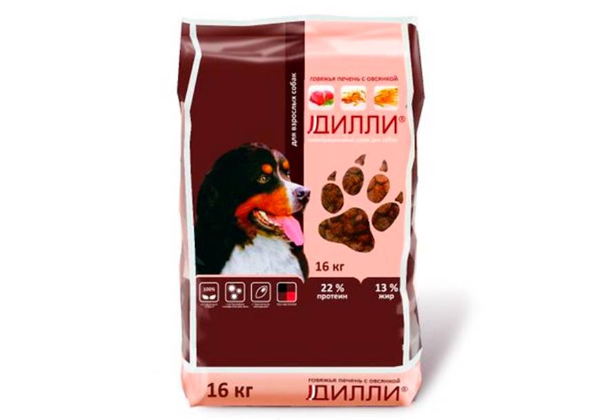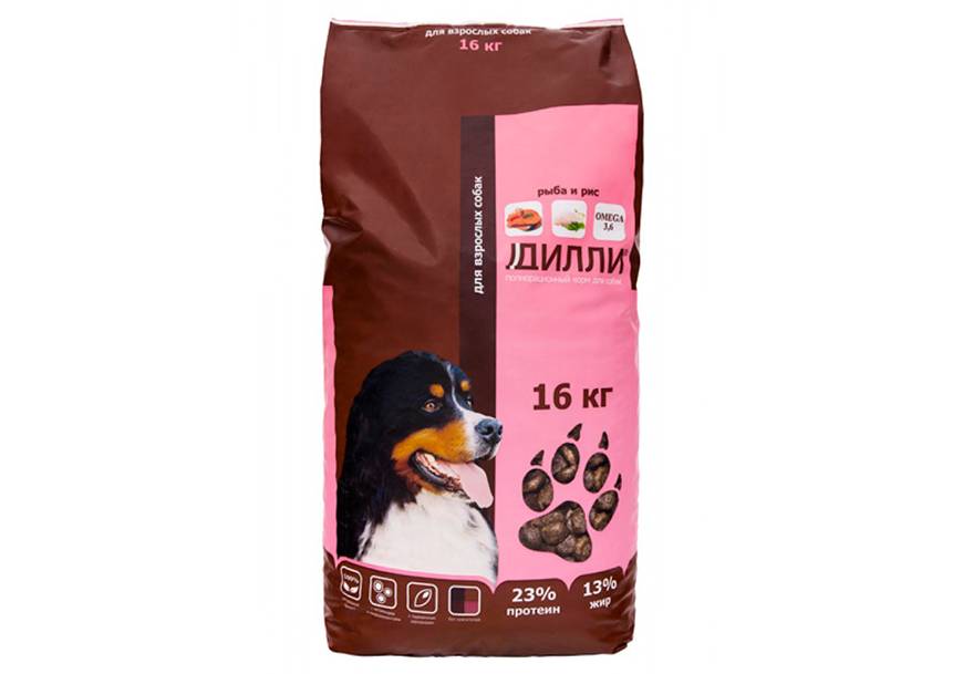 Для взрослых собак разных пород Дилли предлагает наиболее широкую линейку кормов. Они отличаются только составом и калорийностью. Основные продукты: