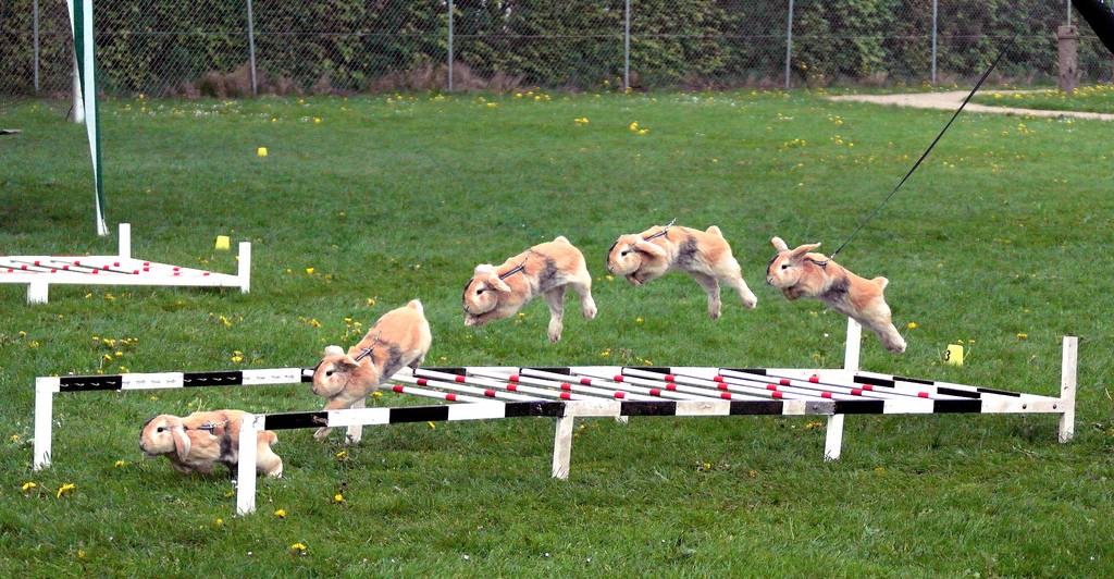 В западной Европе практикуют кроличьи состязания по бегу с препятствиями. В качестве награды зверек получает лакомство.