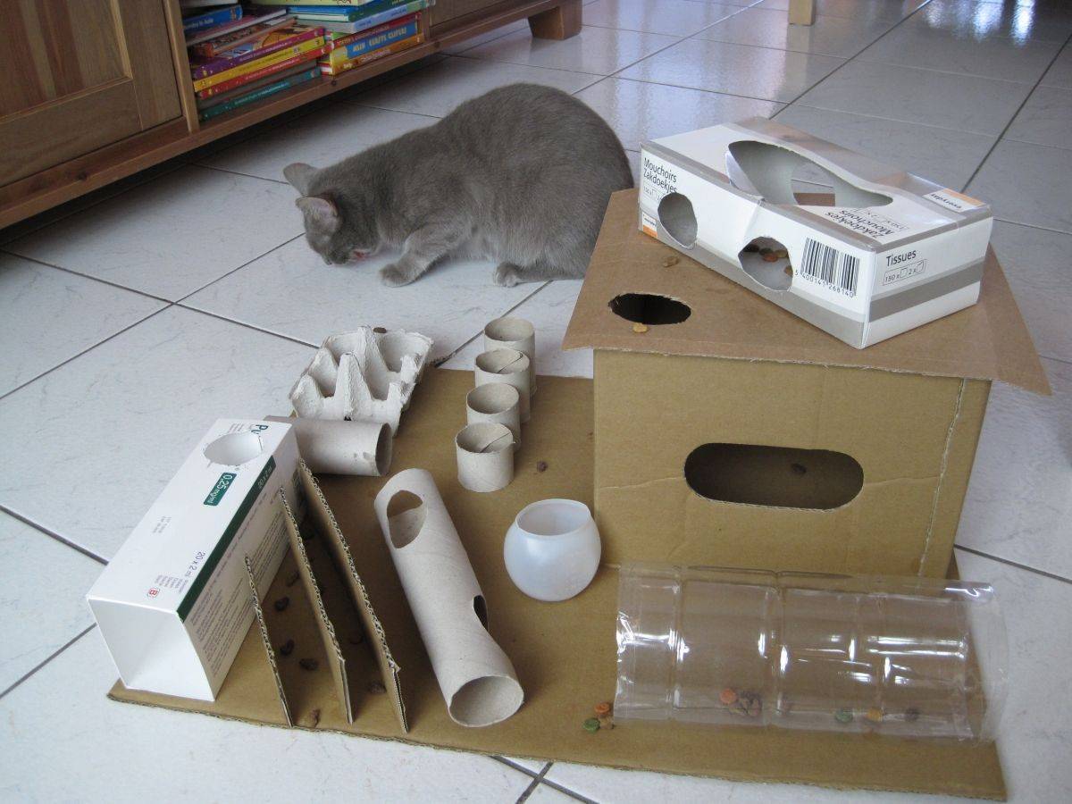 - Одно из любимейших и полезных развлечений для кошек — достать мышку. Мячик (например от пинг-понга), яйцо от «Киндер-сюрприза» с чем-то гремящим внутри, пластиковая крышка от бутылки становятся интереснейшими объектами, если их спрятать под коврик или под коробку. Дёшево и сердито.