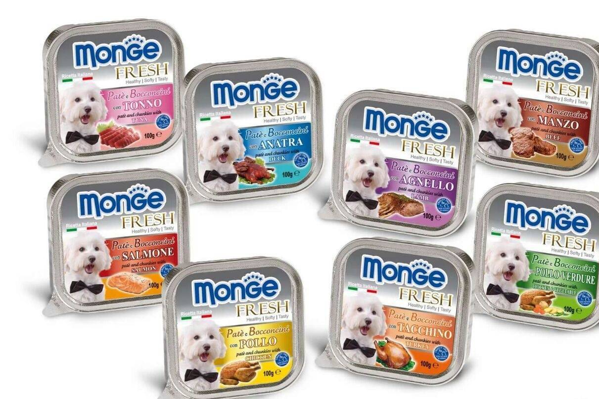 Влажные корма выпускаются в виде мясных кусочков либо паштета в баночках весом 150 и 400 г. Рацион обладает повышенной калорийностью, содержит достаточно жиров, однако количество витаминов снижено, поэтому рекомендуется давать влажный корм Монге для собак попеременно с сухим. Подобное питание представлено следующими видами: