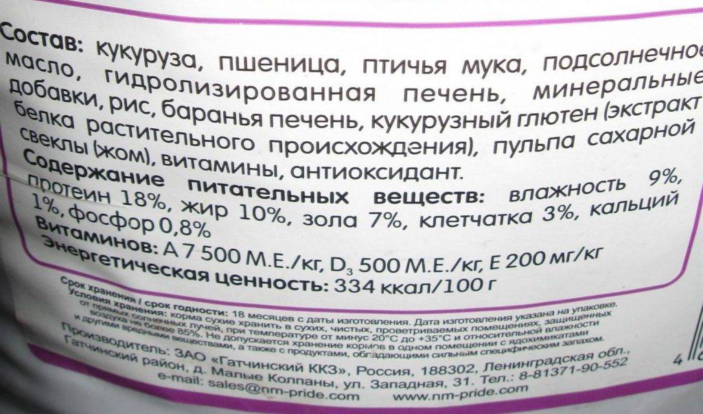 Основу кормов составляют злаки – кукуруза и пшеница. Это не самый лучший источник углеводов для собаки. Данные культуры могут вызвать аллергию у питомца. Источником животного белка выступает птичья мука. То есть, теоретически в ней может содержаться не только мясо, но и субпродукты, хрящи. Дальше в списке идут продукты переработки рыбы. Такой компонент тоже вызывает массу вопросов и сомнений. В качестве источника жиров использовано подсолнечное масло. Источник полезной клетчатки – пульпа сахарной свеклы.