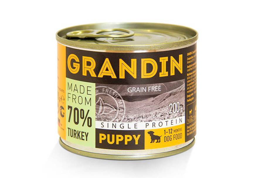 Влажный консервированный корм Грандин имеет богатый мясной сосав. В нем нет добавок, которые не присущи питанию собаки в естественных условиях – зерновых, овощей и фруктов. На упаковке указано «single protein». В качестве добавок выступают: мясной бульон и льняное масло.