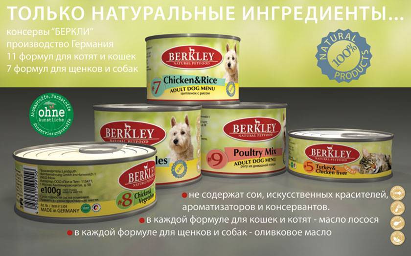 Как уже говорилось выше, линейка кормов «Беркли» содержит в себе только влажные корма. Существует две линейки:
