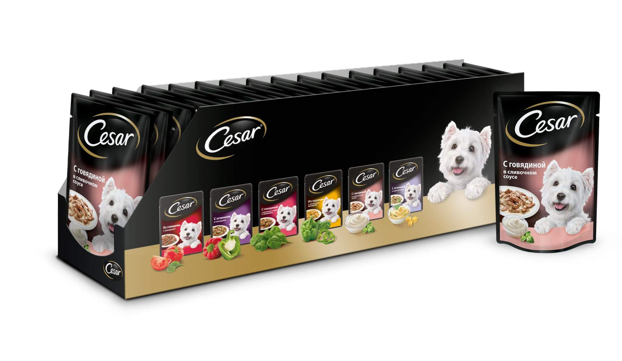 Компания «Цезарь» выпускает для собак корма, в основе которых содержатся мясо, овощи, травы и витамины. В ассортименте насчитывается несколько вкусов: говядина с овощами, ягненок с овощами, кролик с говядиной и шпинатом, курица с зелеными овощами.