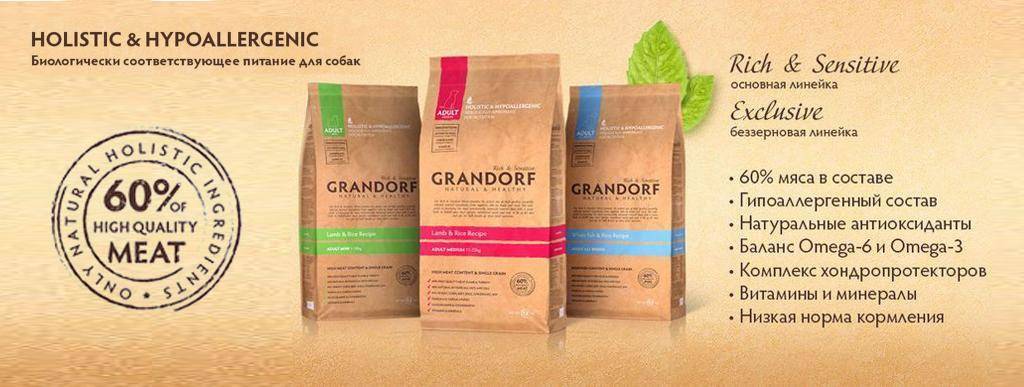 Все выпускаемые компанией «Грандорф» виды питания относятся к премиум-классу категории холистик. Это самые качественные продукты из всех имеющихся на современном рынке. В состав кормов входят исключительно качественные натуральные ингредиенты. Мясная часть занимает не менее 40% в общем составе корма. Это ягненок, утка, индейка, кролик и рыба.