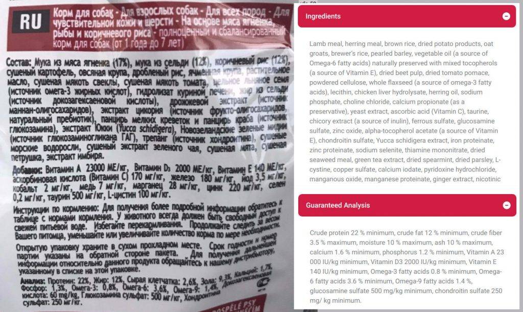 Слева — фото состава указанного на упаковке. Справа — данные с официального сайта корма.