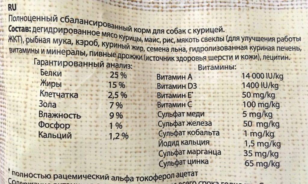 Существуют разные виды еды для домашних питомцев, поэтому стоит рассмотреть вариант с курицей для взрослых собак. На фотографии ниже указаны все ингредиенты, имеющиеся в продукте.