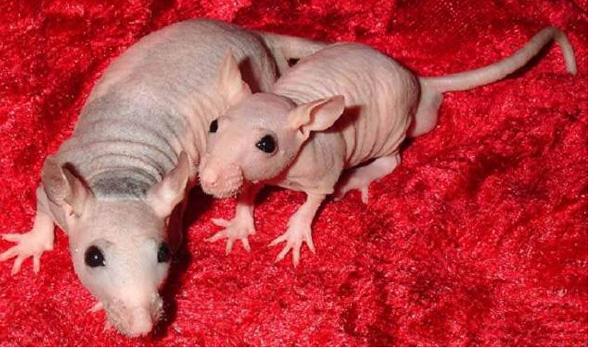 Это разновидность домашних крыс, которые вообще не имеют шерсти. В некоторых случаях в области паха, лапок и головы имеется небольшой пушок. Грызуны имеют розовую кожу, на которой видны складки. У некоторых особей на коже есть пятна черного цвета.