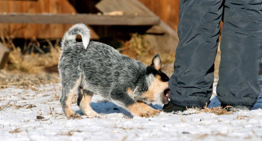 В щенячьем возрасте малыши довольно часто кусают за ноги своих владельцем в процессе воспитания. От этой пагубной привычки их необходимо сразу отучать. При этом, нельзя повышать голос, кричать и применять физическое насилие.