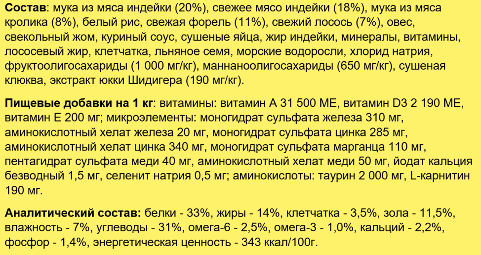 Это логичный маркетинговый ход, поскольку многие покупатели читают только первую строку состава, но поддержать такое решение мы как эксперты не готовы. Наше мнение таково: чем больше качественного мяса в корме, тем лучше, а в данном случае очевидно, что в составе преобладает рис, ведь индейки здесь только чуть больше трети.