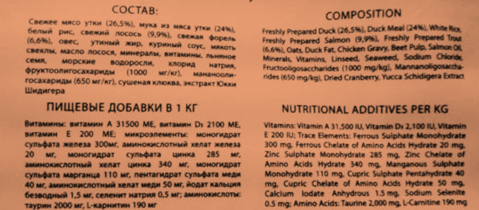 А вот выбор лососевого жира в качестве источника жирных кислот животного происхождения мы поддерживаем. Правда, если бы сюда был добавлен жир индейки, то этот продукт мог бы считаться на 100% монорационом по животному белку. Если в составе жир получен от другого вида животных, птиц или рыб, то он может содержать и молекулы белка соответствующего вида. Впрочем, аллергичным и чувствительным питомцам, кто хорошо переносит и индейку, и лосось, такой продукт вполне может подойти.