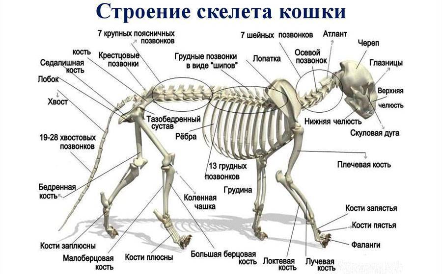Скелет формирует остов кошачьего тела. Кости выполняют не только опорно-двигательную, но и защитную функцию. Кости черепа защищают мозг от механических повреждений, а ребра помогают уберечь в целости сердце и другие внутренние органы. В среднем у кошек около 240 костей. Их точное количество зависит от длины хвоста каждой отдельной особи.