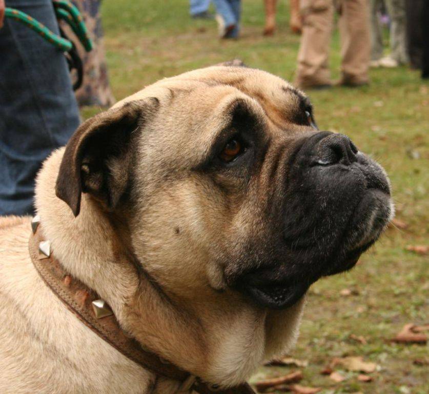 - Морда средней длины (равна черепу), широкая, квадратная, заужена к носу. Челюсти сомкнуты плотно, что обеспечивает хорошую хватку. Прикус типа «перекус». Кожные складки не являются пороком и прописаны стандартом. Губы мясистые, немного брылястые.