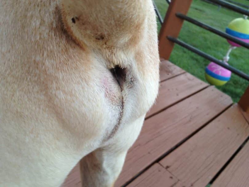 - Мышечный слой желез сильно растягивается, так как содержимое не выливается, а продолжает накапливаться. Сильные боли в области прямой кишки провоцируют у собаки самотравмирование хвоста, лап и крупа.